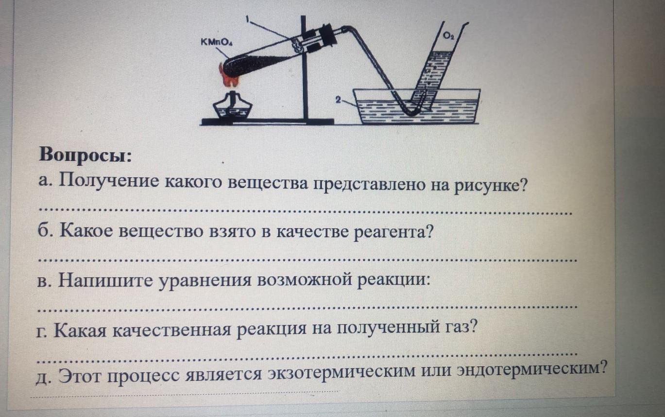 KMnO Вопросы: а. Получение какого вещества представлено на рисунке? 6. Какое вещество взято в качестве реагента? в. Напишите уравнения возможной реакции: г. Какая качественная реакция на полученный газ? д. Этот процесс является экзотермическим или эндотермическим?СРОЧНО ДАИ 50 БАЛЛОВ ПОЖАЛУЙСТА!!!!!!!