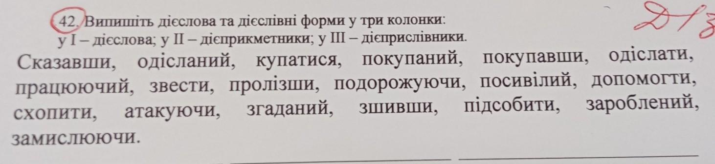 42, Випишіть дієслова та дієслівні форми у три колонки: y I - дієслова; у II - дієприкметники; у ІІІ – дієприслівники. Сказавши, одісланий, купатися, покупаний, покупавши, одіслати, працюючий, звести, пролізши, подорожуючи, посивілий, допомогти, підсобити, зароблений, схопити, атакуючи, згаданий, зшивши, замислююЧИ.
