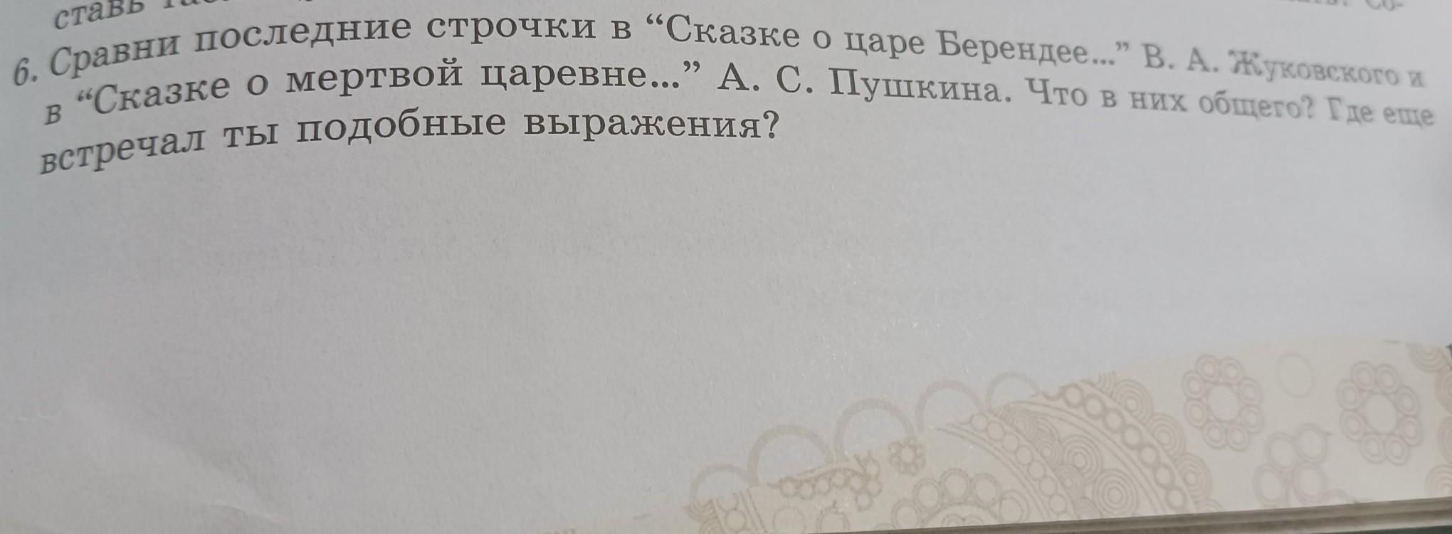 6. Сравни последние строчки в "Сказке о царе Берендее..." В. А. Жуковского и в "Сказке о мертвой царевне..." А. С. Пушкина. Что в них общего? Где еще встречал ты подобные выражения?