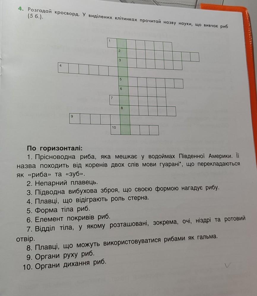 4. Розгадай кросворд. У виділених клітинках прочитай назву науки, що вивчає риб (5 6.). 4 9 1 2 3 5 6 10 8