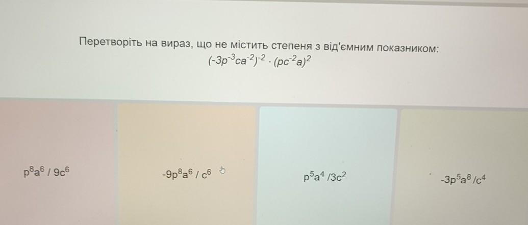 СРОЧНОООО!!!! Перетворіть на вираз, що не містить степеня з від'ємним показником: (-3p-³ca-²)-2 × (pc-²a)²