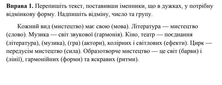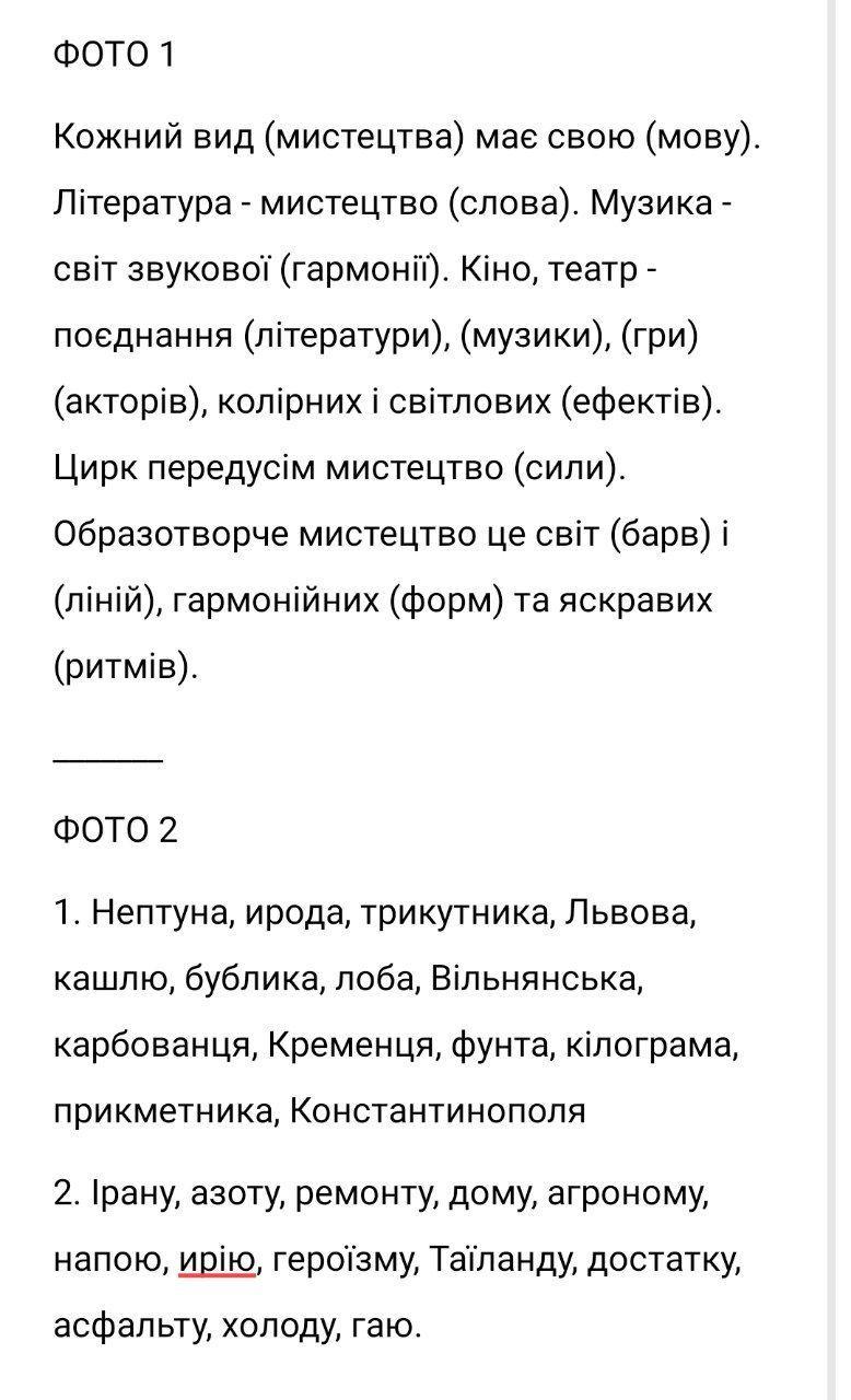 Кожний вид (мистецтва) має свою (мову). Література - мистецтво (слова). Музика - світ звукової (гармонії). Кіно, театр - поєднання (літератури), (музики), (гри) (акторів), колірних і світлових (ефектів). Цирк передусім мистецтво (сили). Образотворче мистецтво це світ (барв) і (ліній), гармонійних (форм) та яскравих (ритмів).