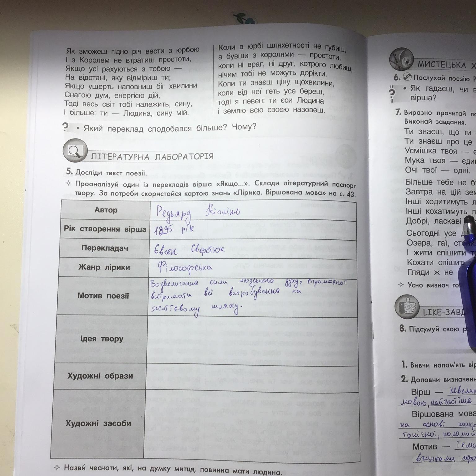 Проаналізуй один із перекладів вірша «якщо…». Склади літературний паспорт твору. За потреби скористайся картою знань «Лірика. Віршована мова» на с. 43