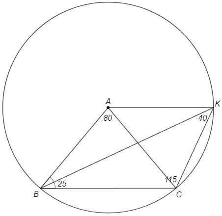 Отрезок BC виден из точки A под углом 80°, а из точки K под вдвое меньшим углом 40°, следовательно точки K, B, C лежат на окружности с центром A (∠BAC - центральный угол, ∠BKC - вписанный угол).