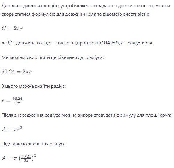 довжина кола 50,24см. Знайди площу круга, обмеженого цим колом. будьласка формулами (C,S,P,r,d)