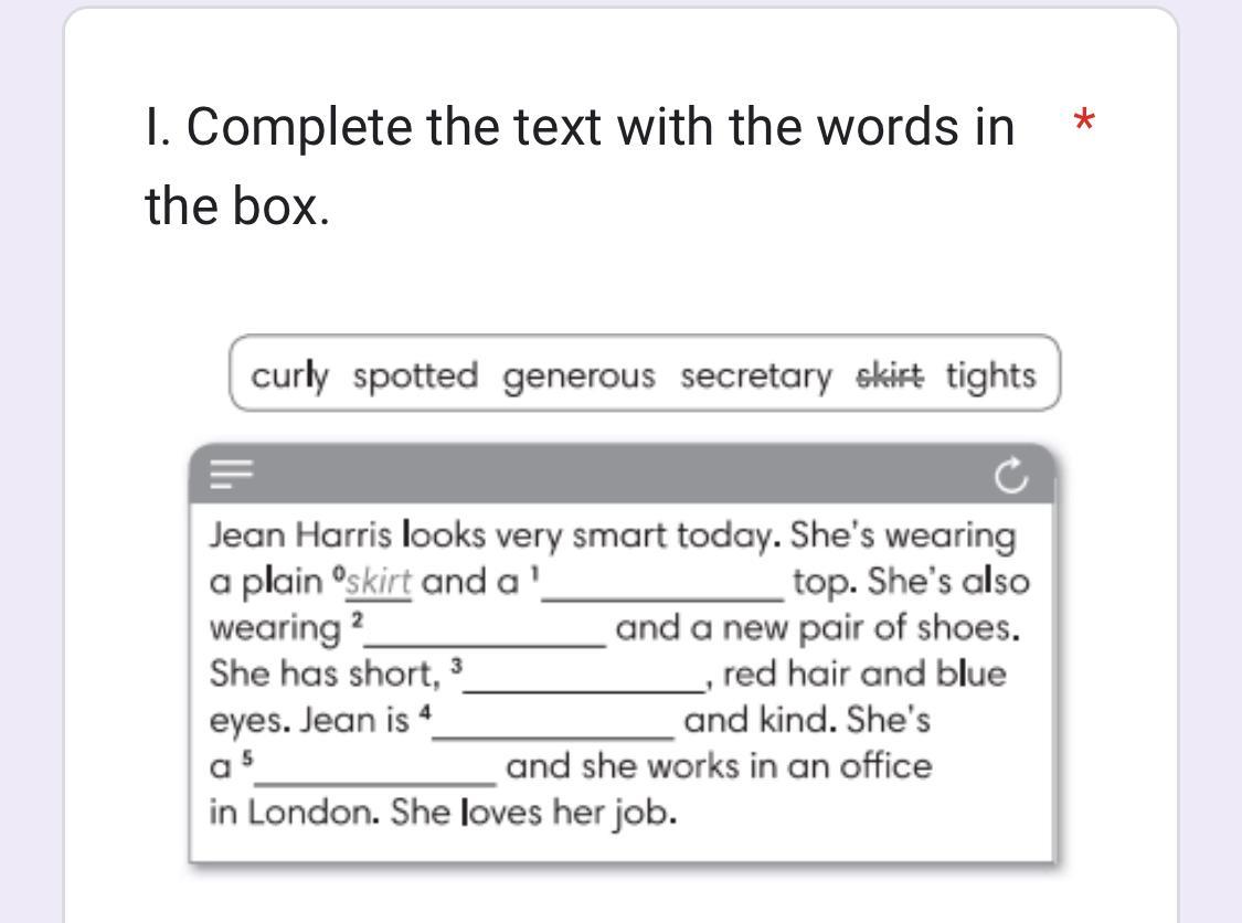 1 spotted 2 tights 3 curly 4 generous 5 secretary..