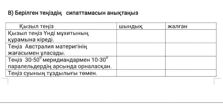 В) Берілген теңіздің сипаттамасын анықтаңыз шындық Қызыл теңiз Қызыл теңiз Үнді мұхитының құрамына кіреді. Теңiз Австралия материгінің жағасымен ұласады. Теңiз 30-50º меридиандармен 10-30° паралельдердің арсында орналасқан. Теңіз суының тұздылығы төмен. жалған