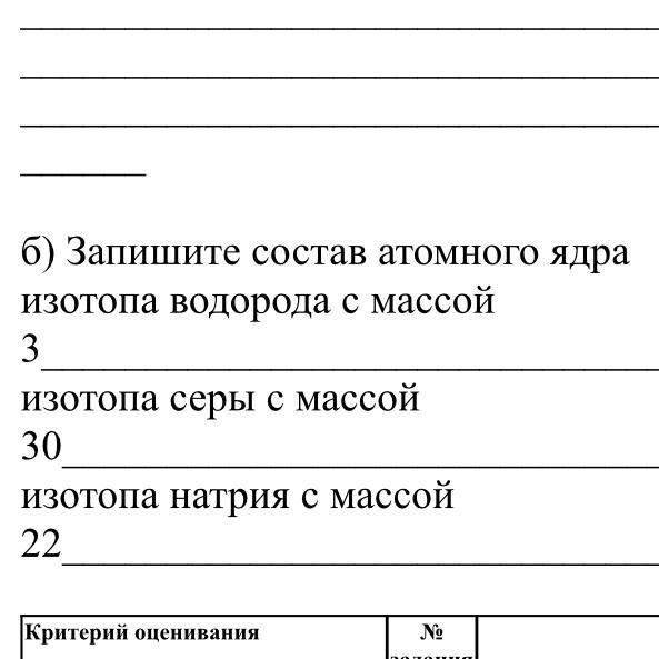 Для сері з масою 30 атомне ядро має 16 протонів (основний ізотоп сери), оскільки у нього завжди кількість протонів співпадає з атомним номером елемента (16), тому масове число 30 означає кількість протонів і нейтронів разом, тобто \(30 - 16 = 14\) нейтронів.