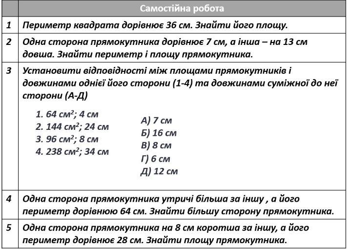 Установити відповідності між площами прямокутників і довжинами однієї його сторони (1-4) та довжинами суміжної до неї сторони (A - A)