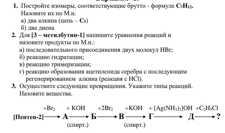 3. Осуществите следующие превращения. Укажите типы реакций. Назовите вещества. [Пентен-2] +Br2_А + КОH(спирт.)_Б+2Br2_В +KOH_Г + [Ag(NH3)2]OH +C2H5Cl_ Д— ? (спирт.)