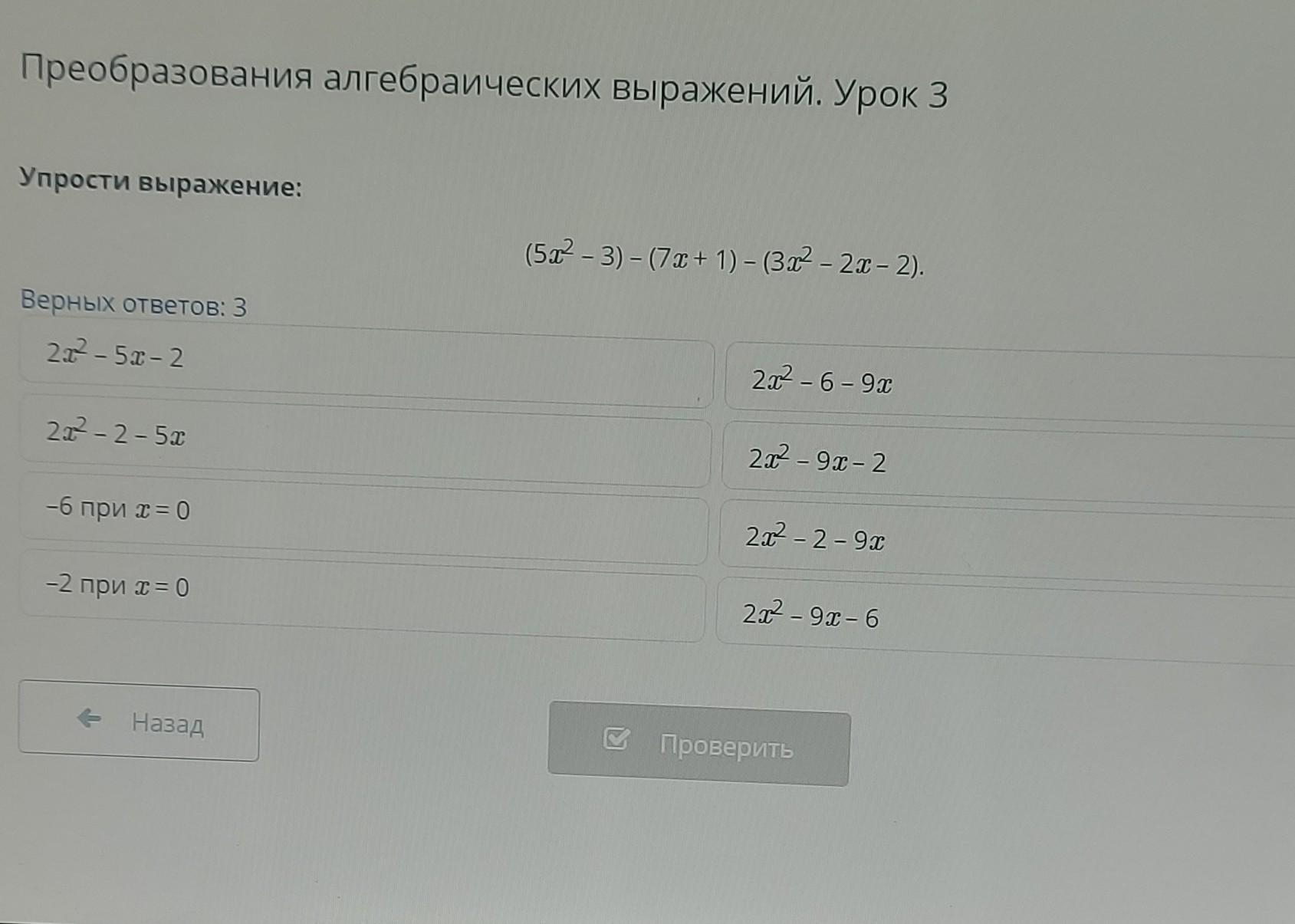 Упрости выражение: Верных ответов: 3 27²-5х-2 2²-2-5х 5 при х=0 -2 при х=0 (52²2-3)-(7z+1)-(32²²-22-2). 22²2²-6-9x 222²-92-2 222²-2-91 27²-92-6