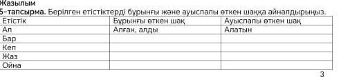 5-тапсырма. Берiлген етiстiктердi бұрынғы жане ауыспалы Бурынгы өткен шақ Алган, алды Етiстiк Ал Бар Кел Жаз Ойна еткен шаққа айналдырыңыз. Ауыспалы еткен шак Апатын