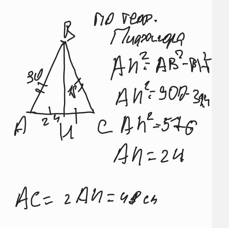 ПУСКАЙ BH - ВЫСОТА. Используя теорему Пифагора находим AH²=AB²-BH² ➡️ AH = 24. AC(основание) = AH*2 = 48, потому что в равнобедренном треугольнике высота, проведённая к основанию это и медиана, и высота, и бисектриса.