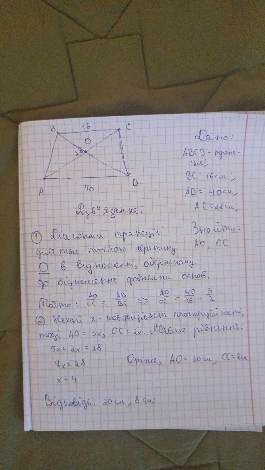 Основи трапеції дорівнюють 16 см і 40 см, а одна з діагоналей 28 см. Знайдіть довжини відрізків, на які цю діагональ ділить точка перетину діагоналей трапеції.