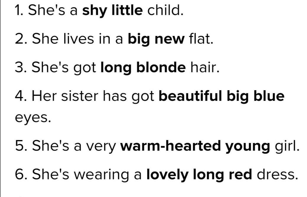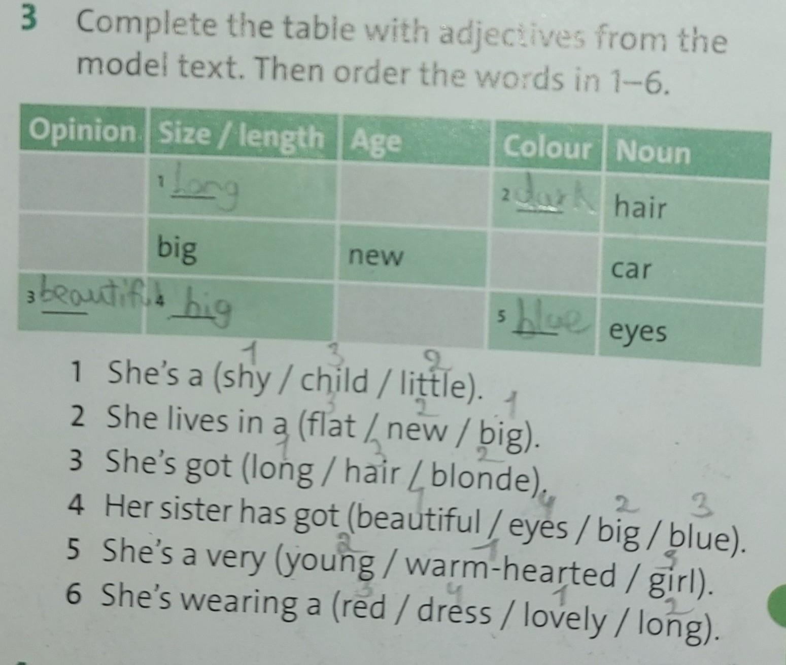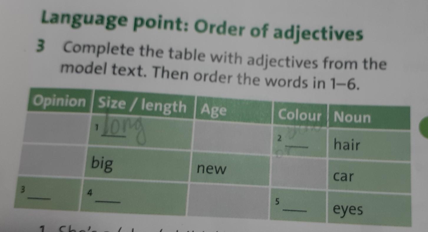 Language point: Order of adjectives 3 Complete the table with adjectives from the model text. Then order the words in 1-6. Opinion Size / length Age 3 big 4 new Colour Noun hair 2 5 - car eyes