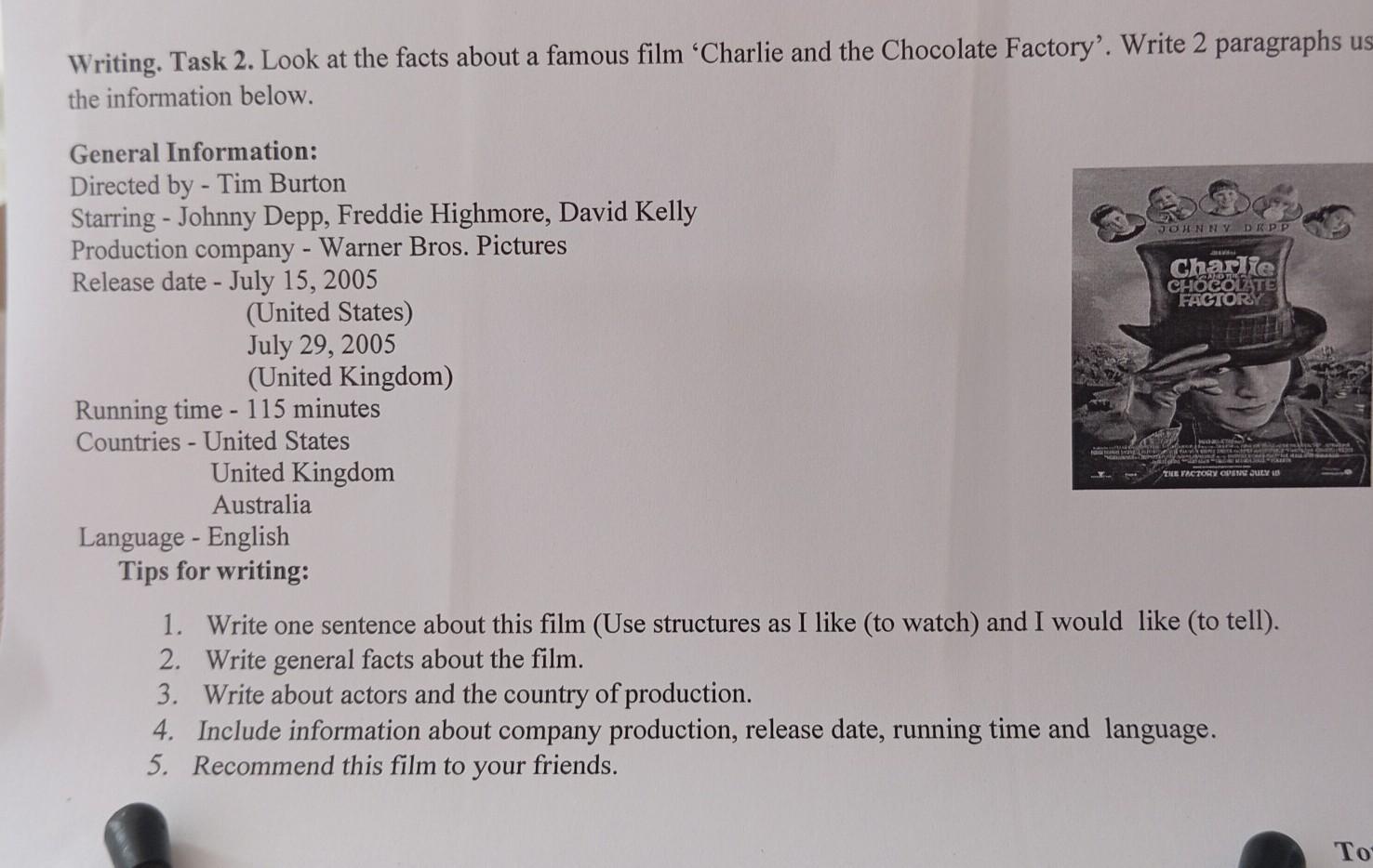 I would like to tell about a famous film “Charlie and the Chocolate Factory”.This film was directed by Tim Burton. Johnny Depp, Freddie Highmore, David Kelly was starring in this film. “Charlie and the Chocolate Factory” was released by Warner Bros in 15th of July in 2005 in United States. The film was released in 29th of July in 2005 in United Kingdom. Its running time is 115 minutes and the original language is English. The countries of production are United States, United Kingdom and Australia.In my opinion, it is a great film, so I can recommend it to anyone who likes to watch films.