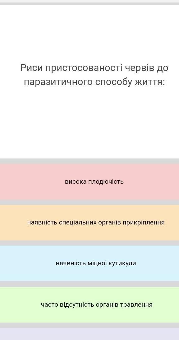 висока плодючiсть,наявнiсть спецiальних органiв прикрiпленния, часто вiдсутнiсть органiв травления