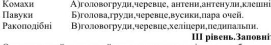 А)головогруди,черевце, антени,антенули,клешні; Б)голова,груди,черевце,вусики,пара очей. В)головогруди,черевце,хеліцери,педипальпи.