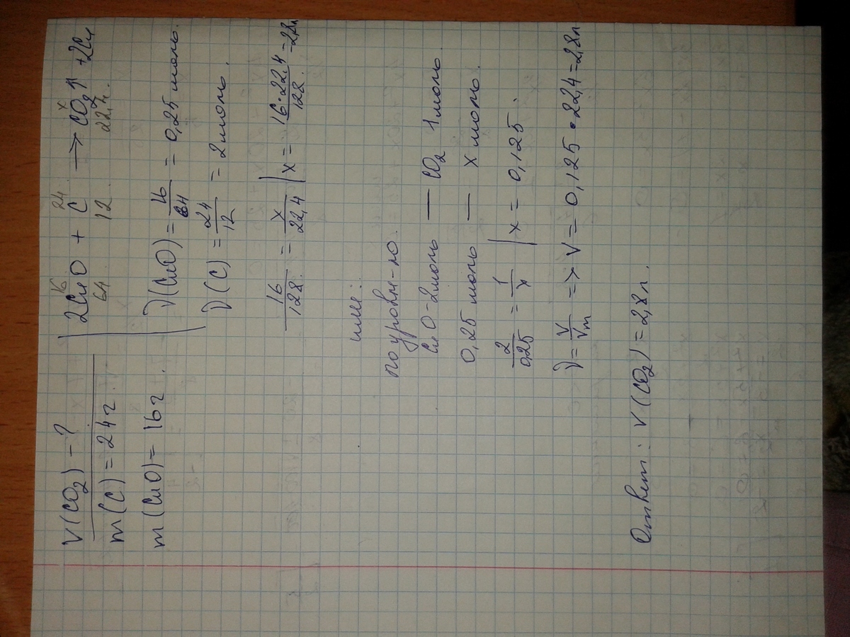 обьем углекислого газа н.у. получится при реакции 24 г углерода и 16 г оксида меди(2ух валентен)