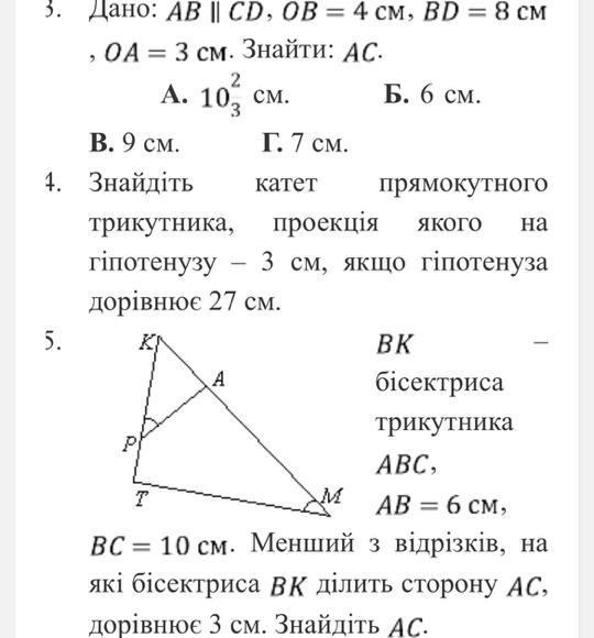 За умовою задачі, ми знаємо, що ВК ділить сторону АС на два відрізки, один з яких дорівнює 3 см. Також, ми знаємо, що ВК є бісектрисою трикутника, тому ми можемо скласти пропорцію:
