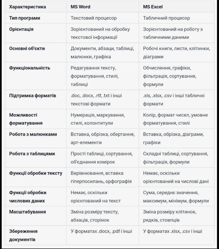 Завдання: Напишіть порівняльну характеристику інтерфейсу MS Word і MS Excel (у вигляді таблиці).