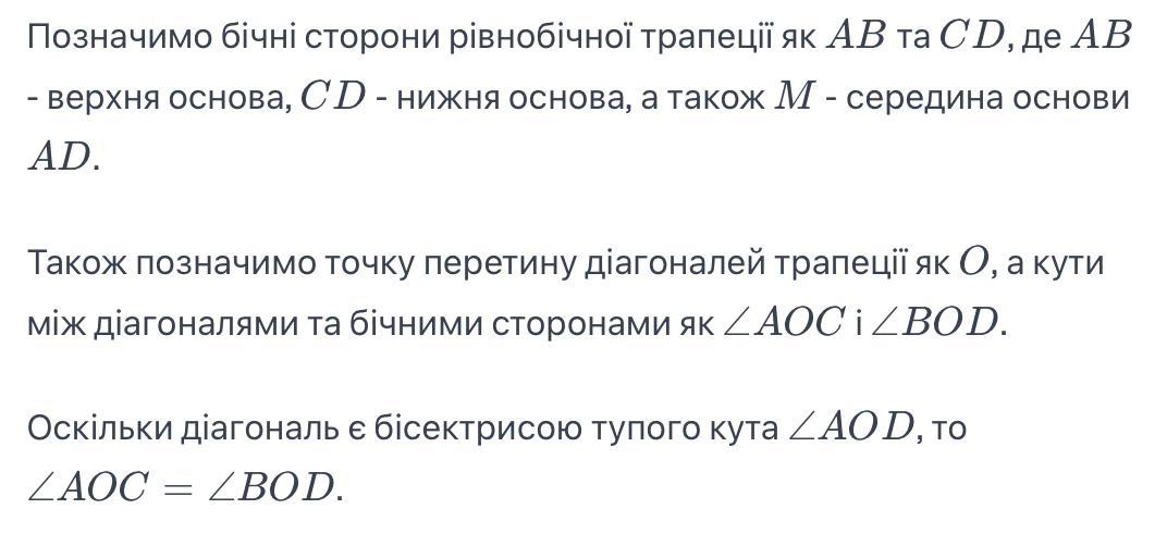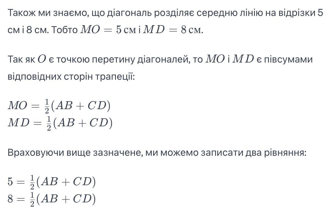 Діагональ рівнобічної трапеції є бісектрисою тупого кута і ділить її середню лінію на відрізки 5 см і 8 см. Знайдіть бічні сторони трапеції.
