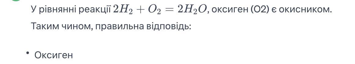 Укажи окисник у рівнянні реакції: 2H2 + O2 = 2H2O