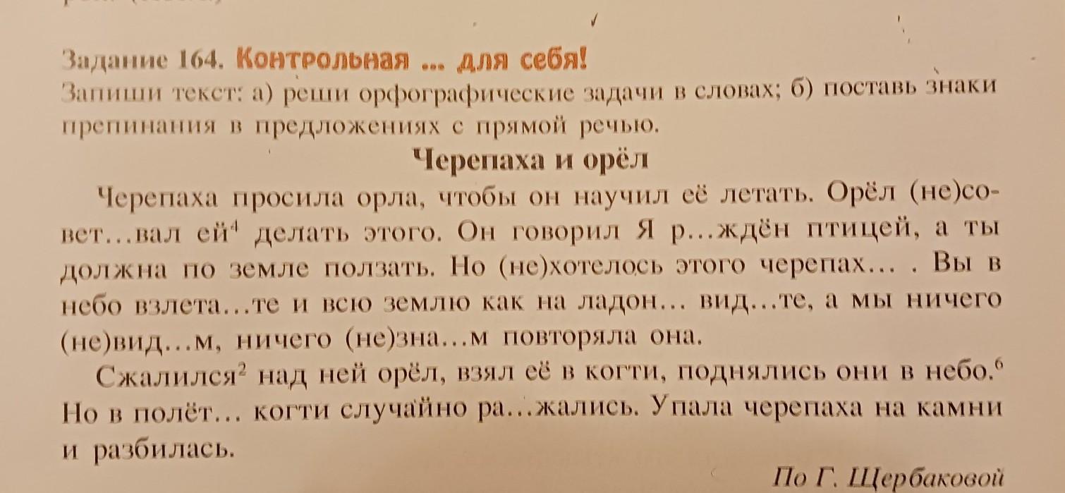 Черепаха просила орла, что бы он научил её летать. Орёл не советовал ей делать этого. Он говорил: Я рожден птицей, а ты должна по земле ползать. Но не хотелось этого черепахе. „Вы в небо взлетаете и всю землю как на ладони видите, а мы ничего не видим, ничего не знаем” повторяла она.