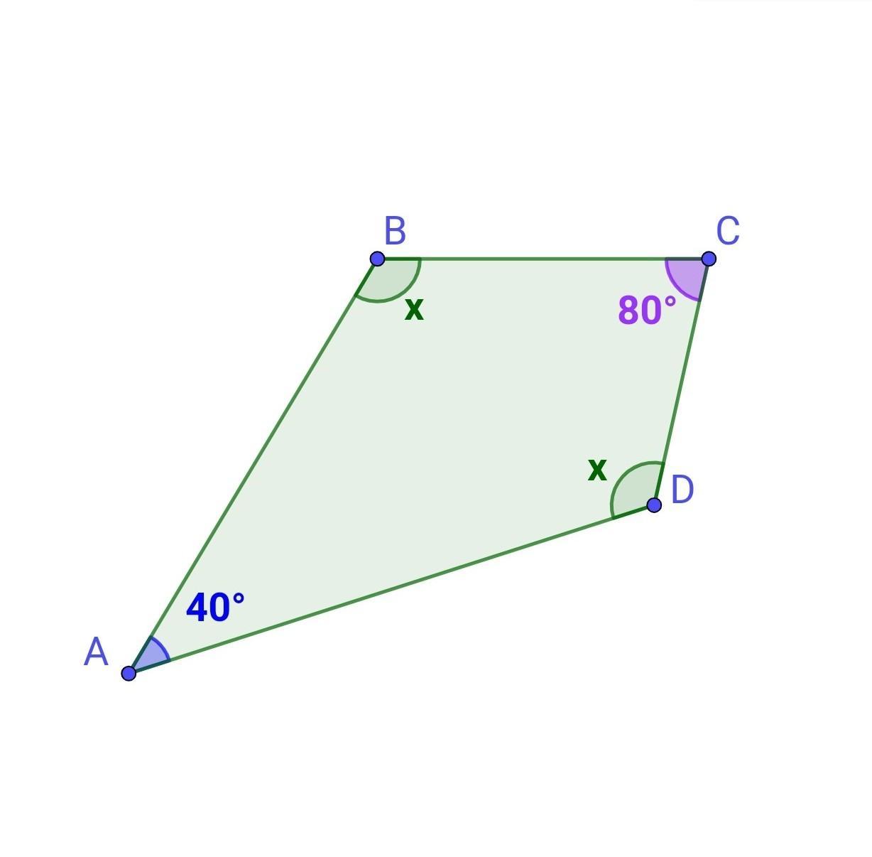 Нехай ABCD даний чотирикутник. ∠А=40°, ∠В=80°, за умовою ∠С=∠D.