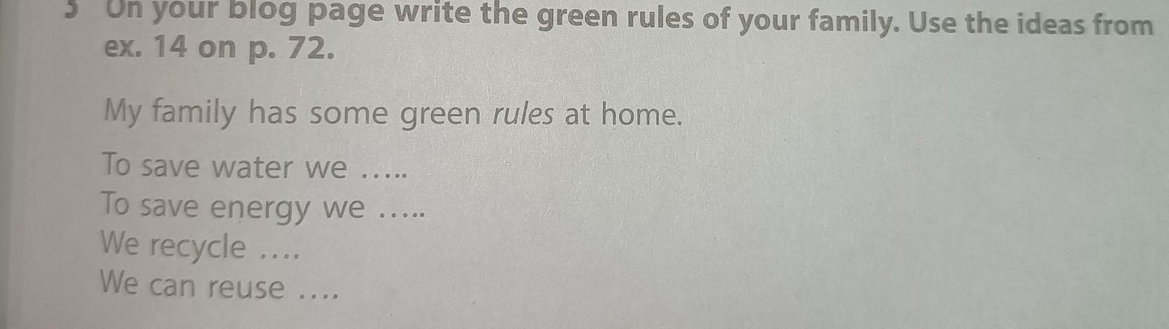 2. To save energy, we make sure to turn off lights and unplug appliances when we're not using them. We also try to use natural light during the day instead of turning on lamps.