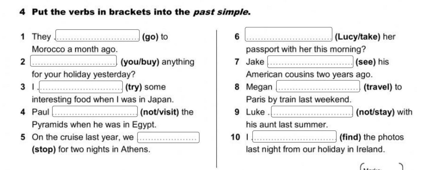 4 Put the verbs in brackets into the past simple. (go) to 1 They 2 Morocco a month ago. (you/buy) anything for your holiday yesterday? 31 (try) some interesting food when I was in Japan. 4 Paul Pyramids when he was in Egypt. 5 On the cruise last year, we (stop) for two nights in Athens. (not/visit) the 6 passport with her this morning? 7 Jake 8 Megan American cousins two years ago. (Lucy/take) her Paris by train last weekend. 9 Luke. his aunt last summer. 10 I (see) his (travel) to (not/stay) with (find) the photos last night from our holiday in Ireland.