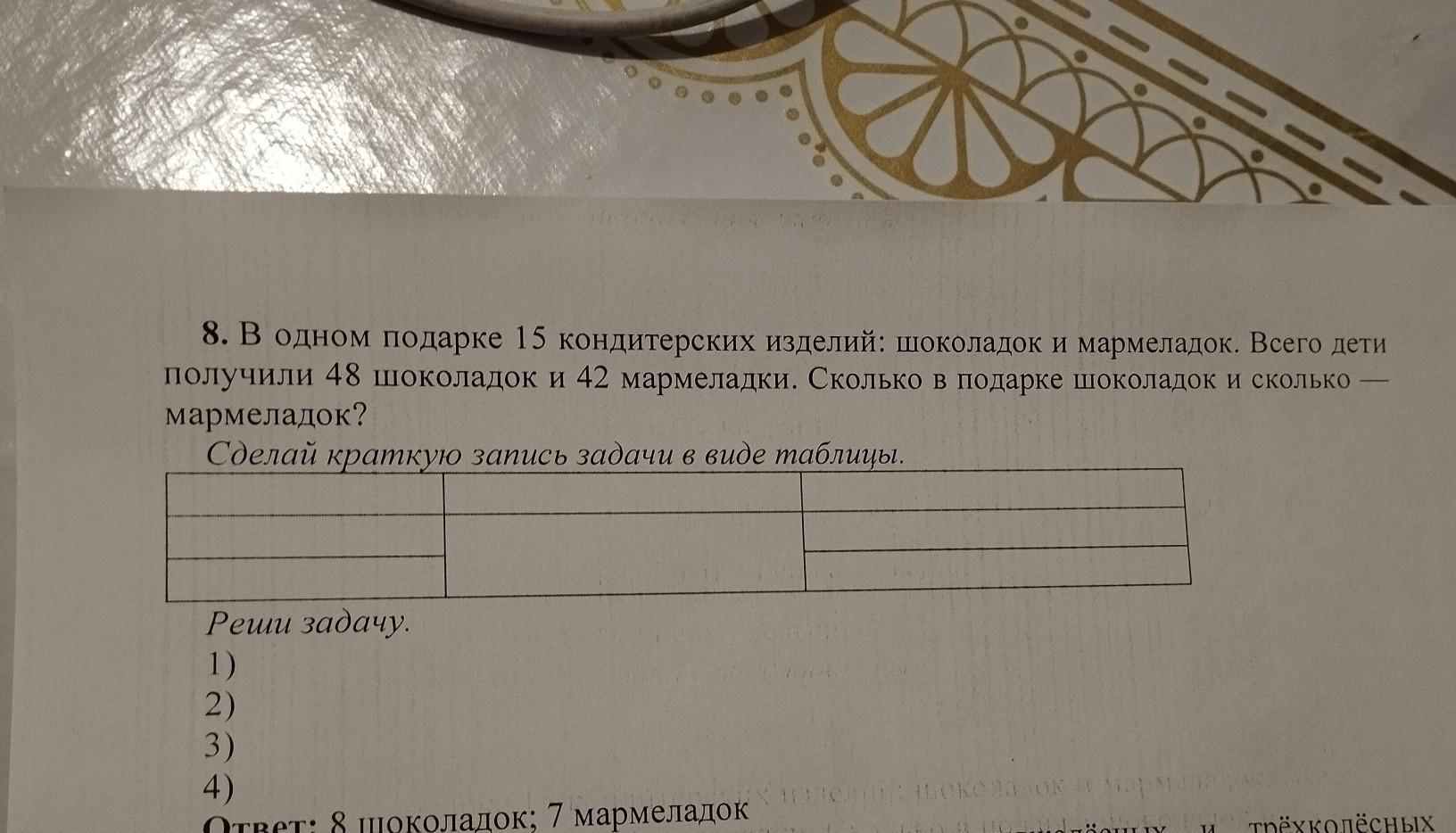 4)42:15=2,8(м)-в одном яшіку мармелад