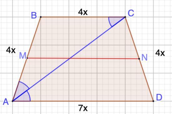 В равнобокой трапеции диагональ АС является биссектрисой, а BC:AD=4:7. Найдите среднюю линию MN, если периметр трапеции равен 76 см.