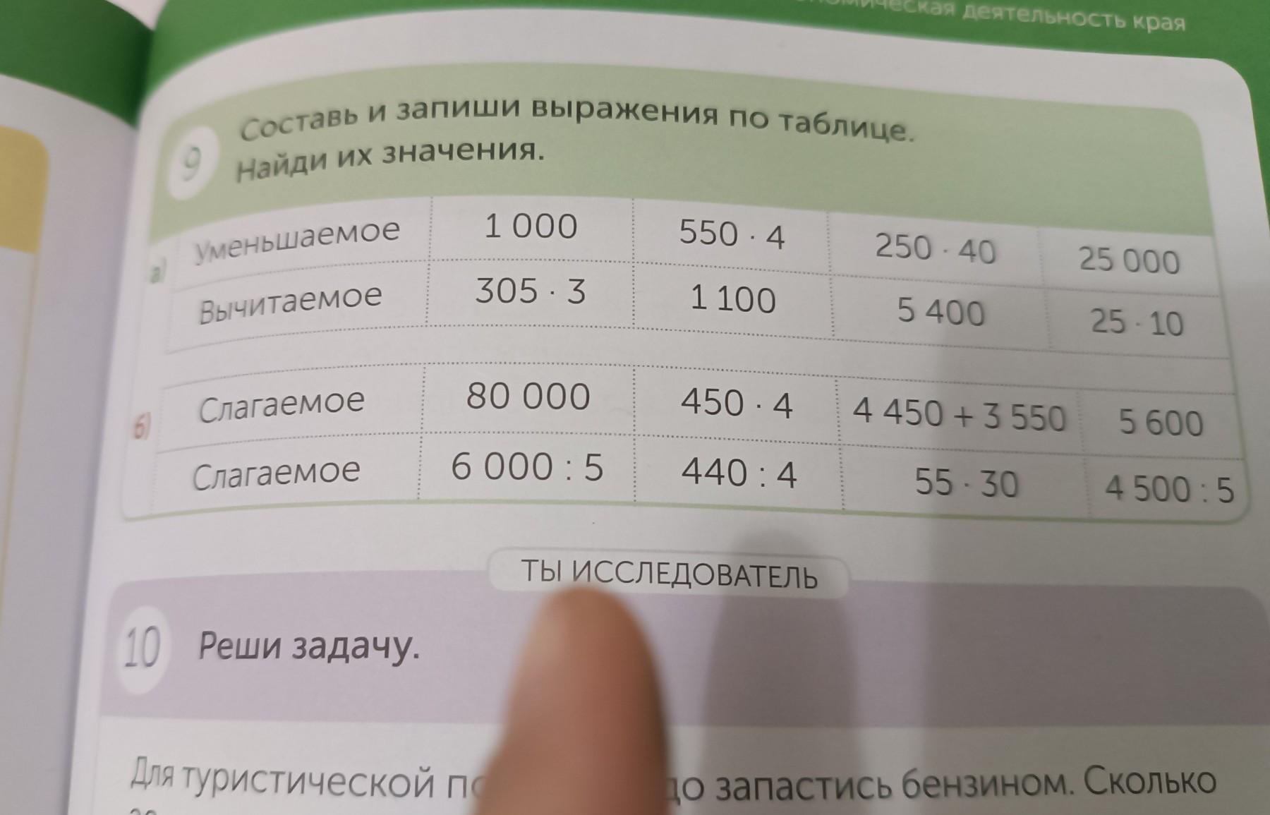 СТОЛБИКОМ‼️9 Составь и запиши выражения по таблице. Найди их значения. Уменьшаемое Вычитаемое Слагаемое Слагаемое 1 000 305 3 80 000 6 000:5 550-4 1100 450 4 440:4 250-40 5 400 4 450 + 3 550 55-30 ность края 25 000 25-10 5 600 4 500:5СТОЛБИКОМ‼️