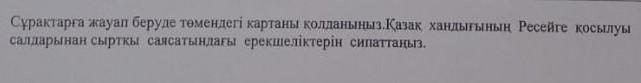 сұрақтарға жауап беркде төмендегі картаға қолданыңыз.Қазақ хандығының Ресейге қосылуы салдарынан сыртқы саясатындағы ерекшеліктерін сипаттаңыз. Жауап беріңіздерші өтініш.
