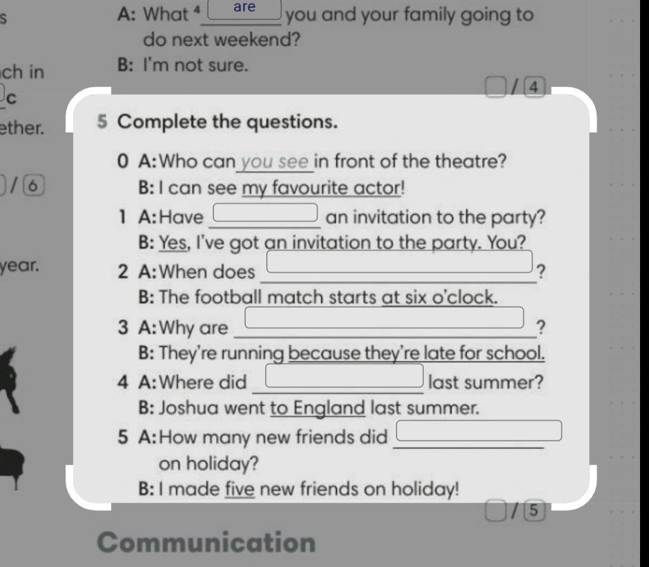 0 A: Who can you see in front of the theatre? B: I can see my favourite actor! 1 A: Have __an invitation to the party? B: Yes, I've got an invitation to the party. You? 2 A: When does ____ ? B: The football match starts at six o'clock. 3 A: Why are___? B: They're running because they're late for school. 4 A: Where did__? B: Joshua went to England last summer. 5 A: How many new friends did___ on holiday? B: I made five new friends on holiday! last summer?