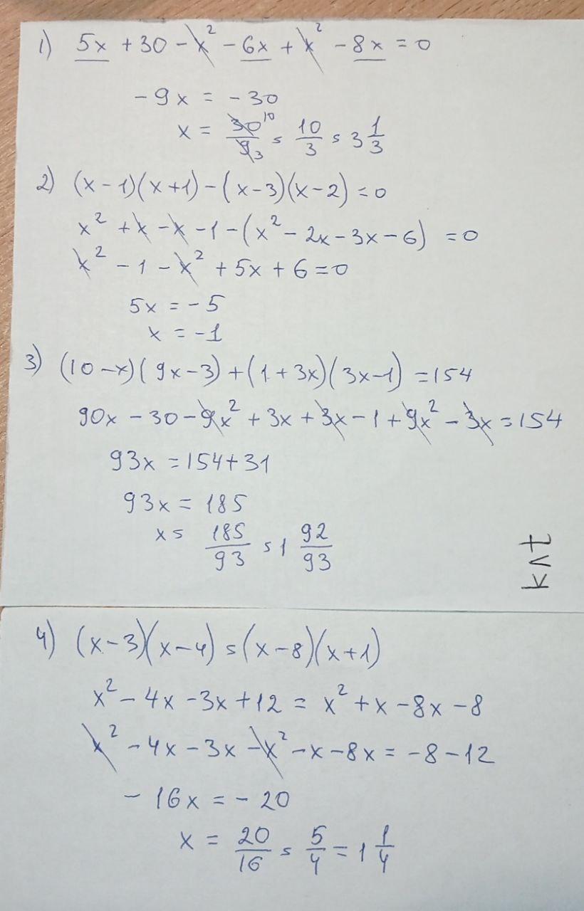 Розв'яжіть рівняння: 1) (5-x)(x+6) + x(x-8)=0; 2) (x-1)(x+1)-(x-3)(x-2)= 0; 3) (10-x)(9x-3)+(1+3x)(3x-1)=154; 4) (x-3)(x-4)=(x-8)(x+1).
