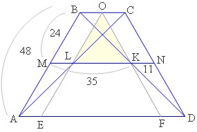 Проведём ОЕ и ОF параллельно боковым сторонам через точки пересечения средней линии трапеции с её диагоналями.