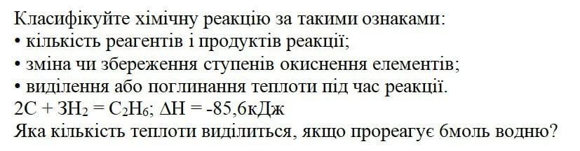 - Виділення або поглинання теплоти під час реакції: У даній реакції виділяється теплота, що позначено символом ΔΗ = -85,6 кДж.