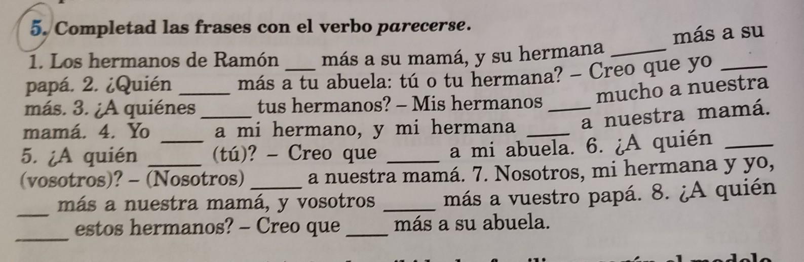5. Completad las frases con el verbo parecerse. más a su mamá, y su hermana 1. Los hermanos de Ramón papá. 2. ¿Quién más. 3. ¿A quiénes mamá. 4. Yo 5. ¿A quién (vosotros)? - (Nosotros) más a tu abuela: tú o tu hermana? - Creo que yo tus hermanos? - Mis hermanos a mi hermano, y mi hermana (tú)? - Creo que más a su más a nuestra mamá, y vosotros estos hermanos? - Creo que mucho a nuestra a nuestra mamá. a mi abuela. 6. ¿A quién a nuestra mamá. 7. Nosotros, mi hermana y yo, más a vuestro papá. 8. ¿A quién más a su abuela.