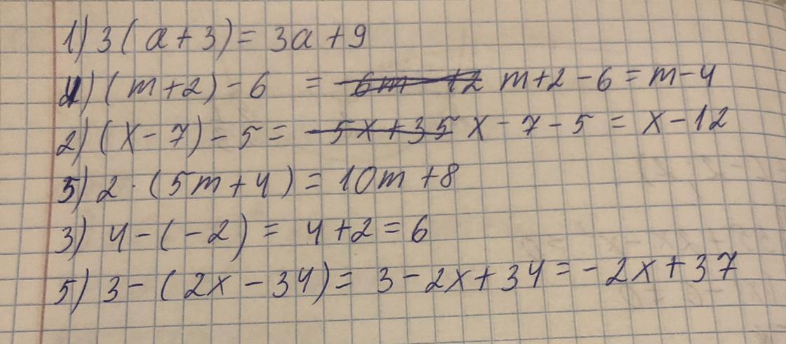 Розкрий дужки: ✔ 1) 3 (a + 3); 4) (m + 2) - 6; 2) (x -- 7) - 5, 5) 2 . (5m + 4*); 3) 4 - ( -. 2), 5) 3 - (2x - 34).