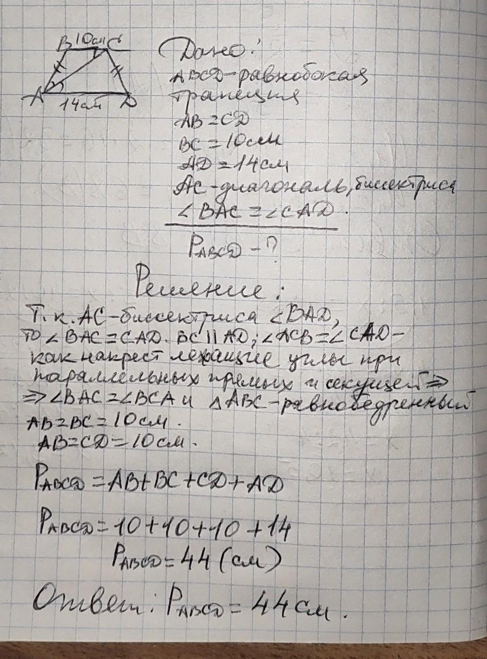 Основи рівнобічної трапеції дорівнюють 10см та 14см, а діагональ є бісектрисою гострого кута. Знайдіть периметр заданої трапеції.