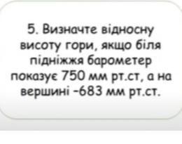 нормальне атмосферне давлення ставить 720 мм от.ст падання давлення з висоти на кожні 100 м висоти — 10мм р.с якщо у нас ставлення на вершині буде - 520 мм р.с. до падіння составить 1240 мм р.с. 1240 р.с. ділимо 10 і множимо на 100. горної вершини рівна 12400 м