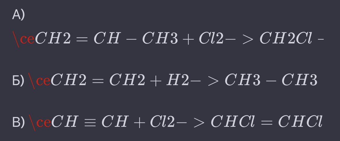 Напишіть рівняння реакцій, які характеризують хімічні властивості, за наведеними схемами, назвіть речовини А) СН2 = СН – СН3 + Cl2 → Б) СН2 ═ СН2 + H2 → В) СН ≡ СН + Cl2 →