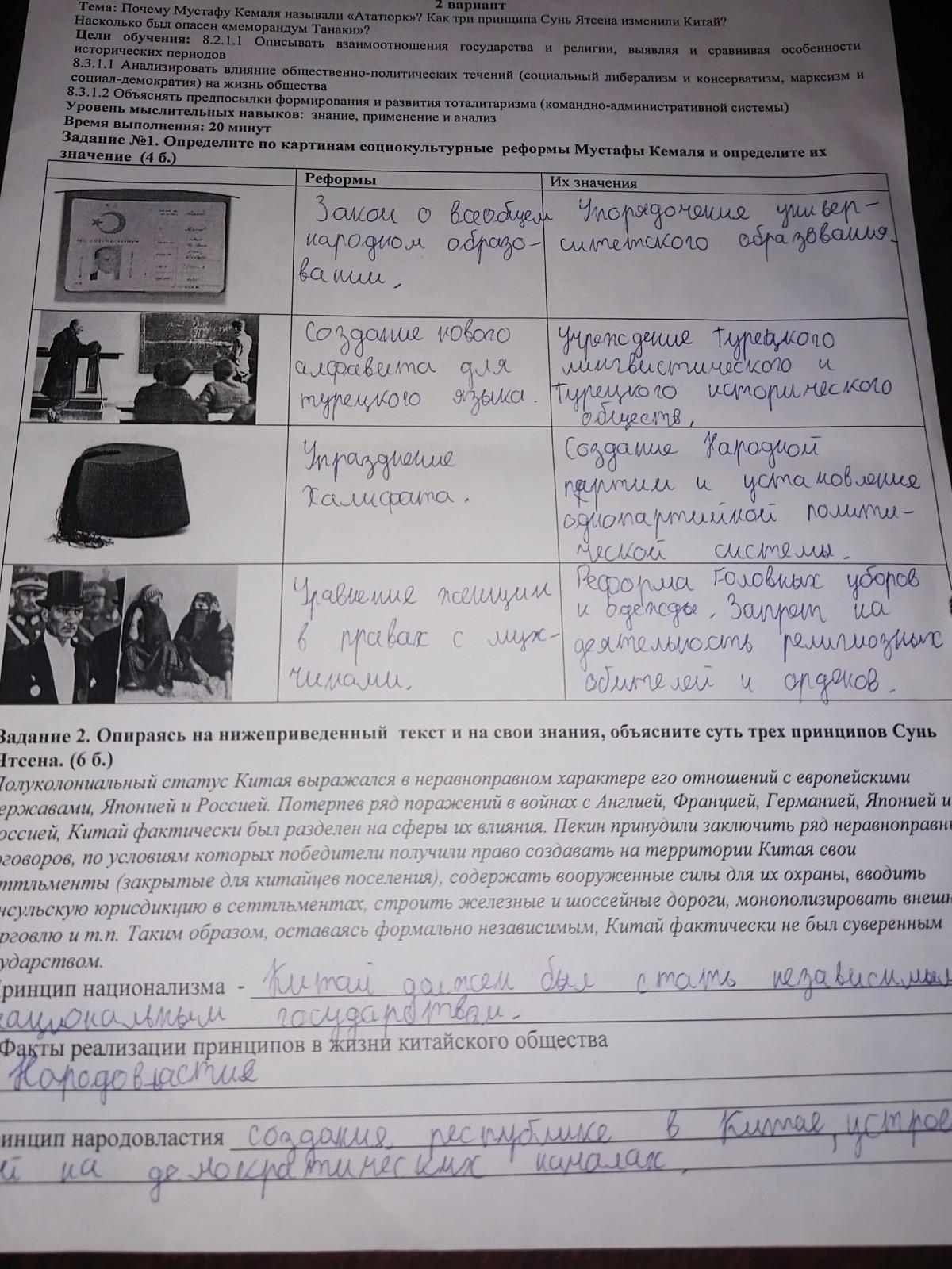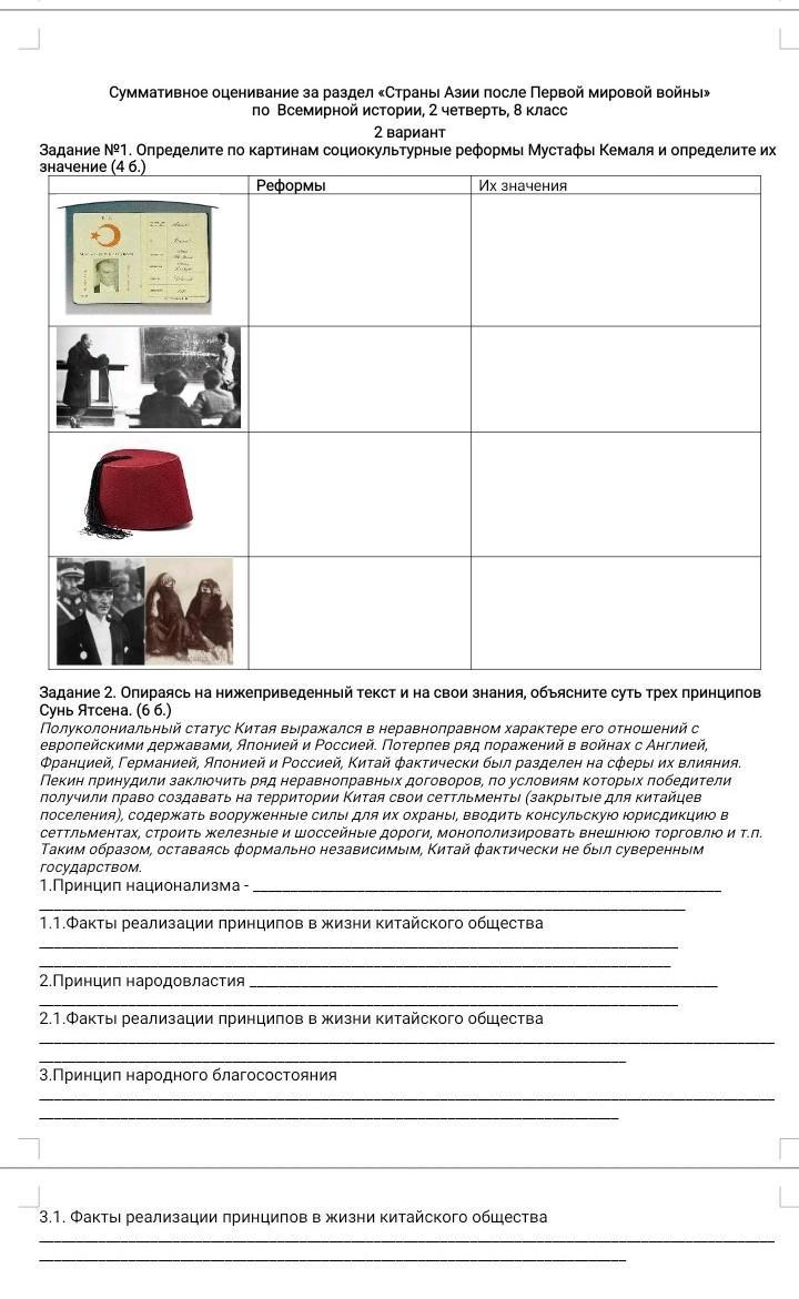 по всемирной истории, 2 четверть, 8 класс 2 вариант Задание №1. Определите по картинам социокультурные реформы Мустафы Кемаля и определите их значение (4 б.) Реформы Их значения IT2 стають Задание 2. Опираясь на нижеприведенный текст и на свои знания, объясните суть трех принципов Сунь Ятсена. (6 б.) Полуколониальный статус Китая выражался в неравноправном характере его отношений с европейскими державами, Японией и Россией. Потерпев ряд поражений в войнах с Англией, COLOPER HER Францией, Германией, Японией и Россией, Китай фактически был разделен на сферы их влияния. Пекин принудили заключить ряд неравноправных договоров, по условиям которых победители получили право создавать на территории Китая свои сеттльменты (закрытые для китайцев поселения), содержать вооруженные силы для их охраны, вводить консульскую юрисдикцию в сеттльментах, строить железные и шоссейные дороги, монополизировать внешнюю торговлю и т.п. Таким образом, оставаясь формально независимым, Китай фактически не был суверенным государством. 1.Принцип национализма 1.1.Факты реализации принципов в жизни китайского общества 2.Принцип народовластия 2.1.Факты реализации принципов в жизни китайского общества 3.Принцип народного благосостоян 2-вариант Критерии 3.1. Факты реализации принципов в жизни китайского общества No Пескрипторы Балл