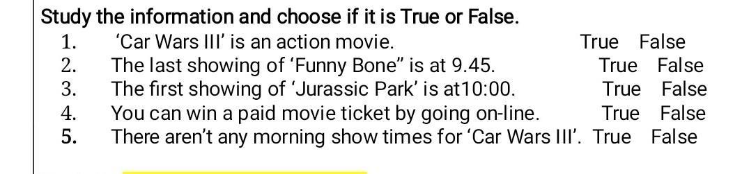 Study the information and choose if it is True or False. 1. 'Car Wars III' is an action movie. 2. True False 3. True False The last showing of 'Funny Bone" is at 9.45. The first showing of 'Jurassic Park' is at 10:00. You can win a paid movie ticket by going on-line. There aren't any morning show times for 'Car Wars III'. True False 4. True False 5. True False