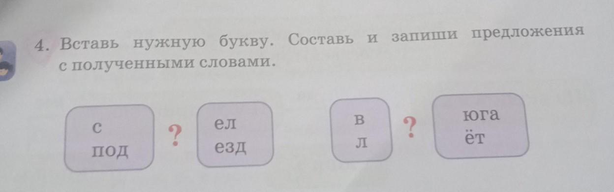 4. Вставь нужную букву. Составь и запиши предложения с полученными словами. C под ? ел езд BH В Л ? юга ёт