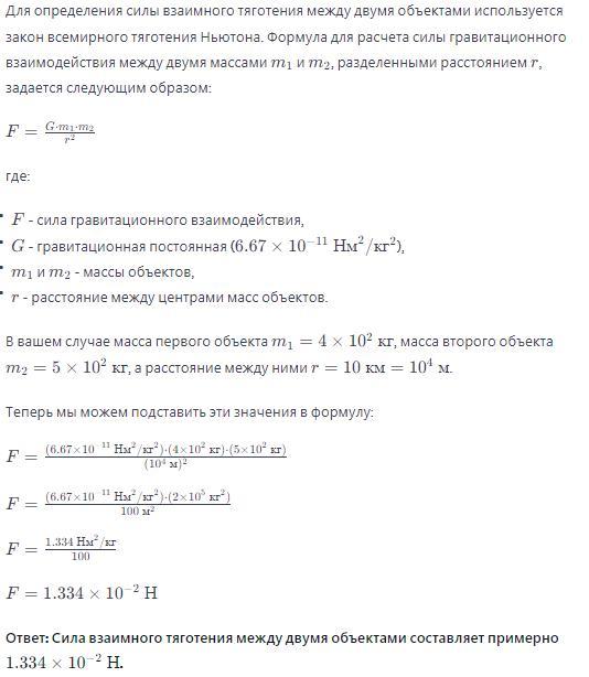 1.Два космических объекта находятся на расстоянии 10 км друг от друга. Масса первого объекта 4*102 кг, масса второго 5*10. 2.Определите силу их взаимного тяготения (G-6.67* 10" Нм/кг).