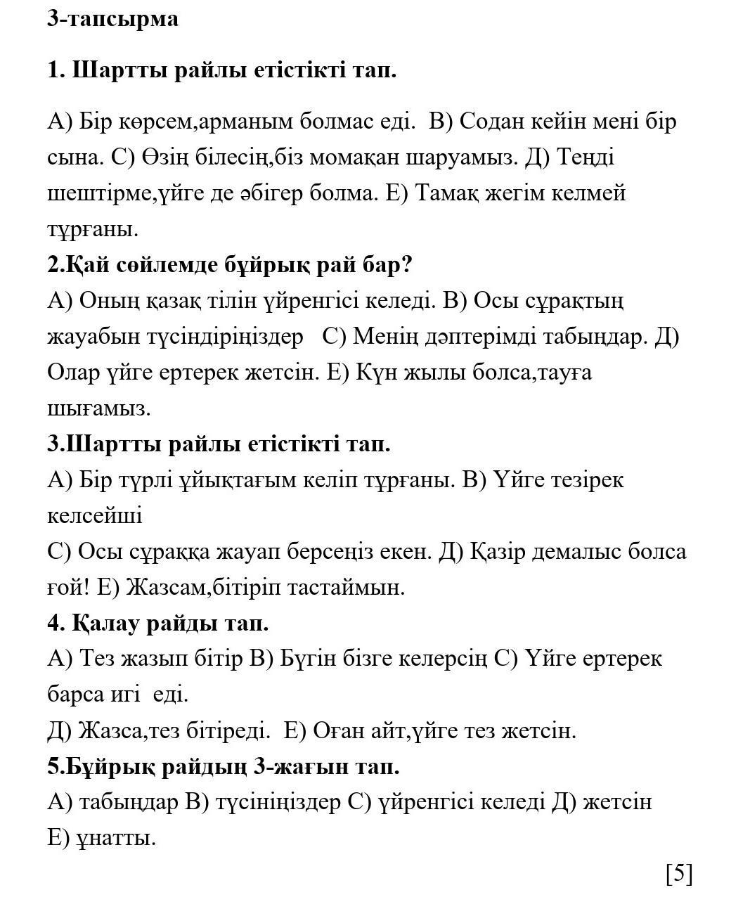 2.Қай сөйлемде бұйрық рай бар? А) Оның қазақ тілін үйренгісі келеді. В) Осы сұрақтың жауабын түсіндіріңіздер С) Менің дәптерімді табыңдар. Д) Олар үйге ертерек жетсін. Е) Күн жылы болса,тауға шығамыз.