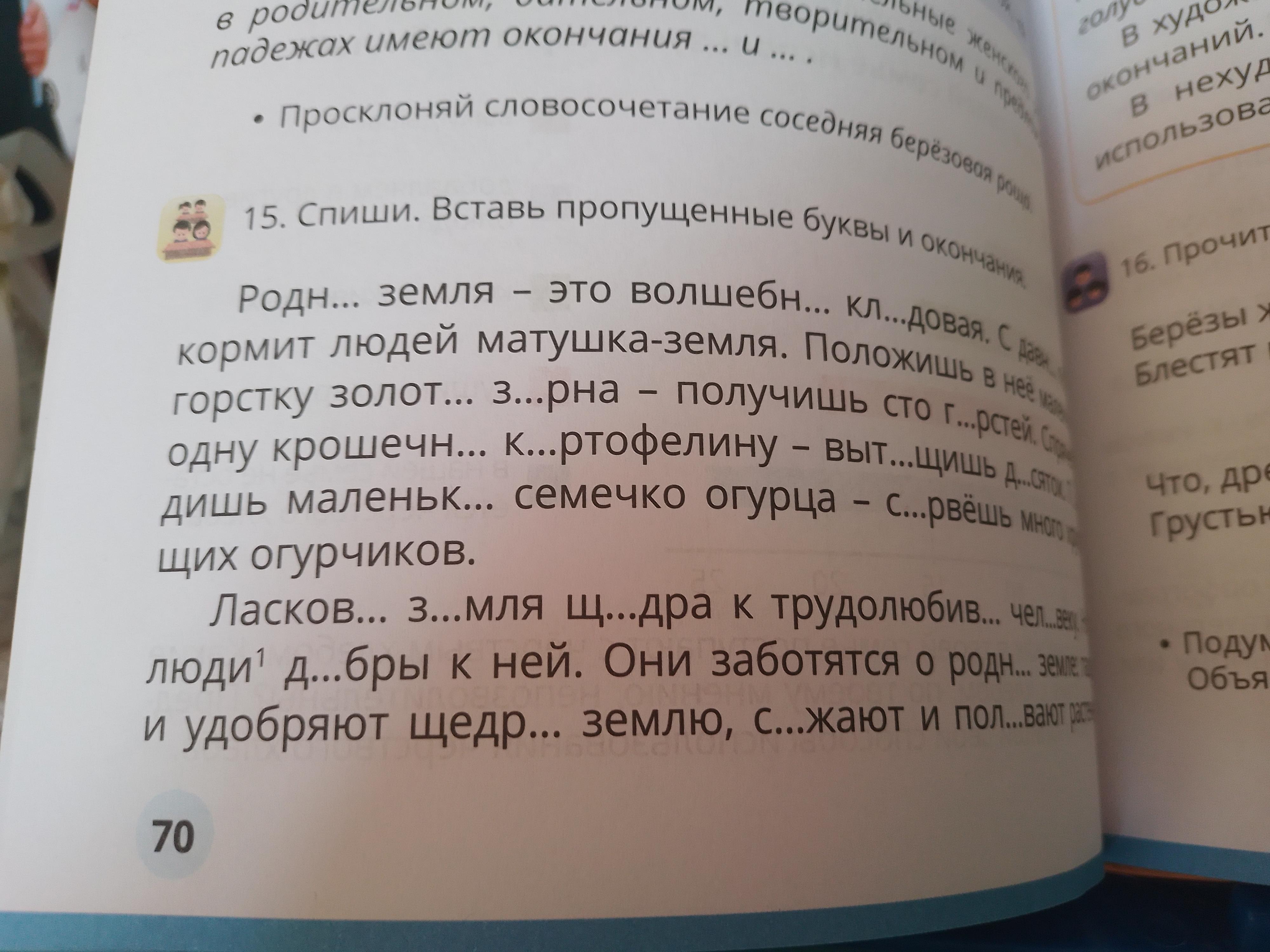земле: пашут и удобряют щедр(ую,в.п.,ед.ч.ж.р.) землю, сажают и поливают растения. Своим упорным трудом люди благодарят землю-кормилицу за волшебн(ые,в.п.,мн.ч.,м.р.) дары.